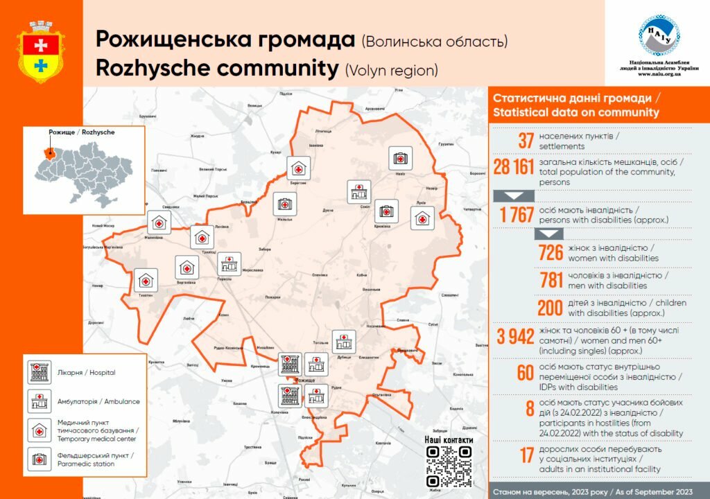 Наступне картографування ми провели у Рожищенській територіальній громаді, що на Волині. Вона об’єднує 37 населених пунктів, загальна кількість населення — 28 161. З них 1 767 осіб мають інвалідність: це 726 жінок, 781 чоловіків та 200 дітей. Серед ЛзІ є переселенці (60), учасники бойових дій (8) та люди старшого віку, які перебувають у соціальних інституціях (17).