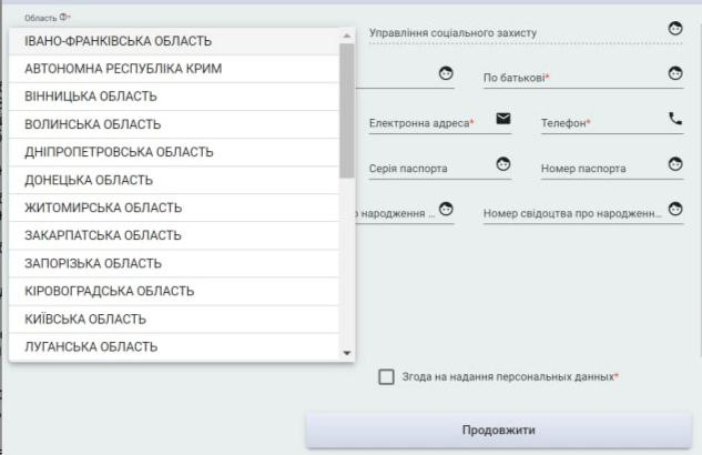 Під час заповнення форми потрібно – вибрати назву області, де ви живете зі списку, який буде на екрані – вибрати управління соціального захисту за місцем свого проживання зі списку, який буде на екрані |