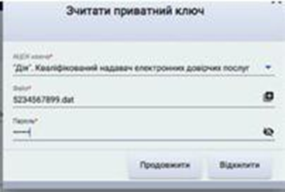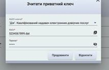 Після натискання кнопки Подати заяву людині надається форма Зчитати приватний ключ. Тут треба ввести інформацію про свій електронний підпис, а саме – вибрати, який у вас підпис за допомогою списку, який буде на екрані – вибрати файл зі своїм електронним підписом з комп’ютера або флешки – ввести пароль |