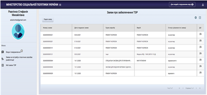 На порталі можна побачити список заяв про потреби у технічних засобах реабілітації, які подала людина. У заяві є така інформація: – номер заяви – дата подання заяви – група виробу – виріб – статус рішення по заяві – піктограма |