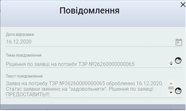 Статус рішення по заяві – це інформація про те, що відбувається з заявою. Після подання заяви буде відображений статус – на розгляді. Після того, як заяву розглянуть, буде відображено статус про прийняте рішення. Прийняте рішення може бути задовільнити або відмовити. |