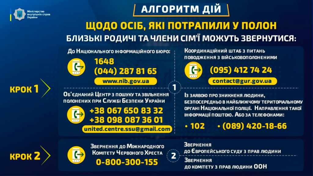 Для отримання або надання інформації громадяни можуть звернутися до Об’єднаного Центру з пошуку та звільнення полонених при Службі Безпеки України. Це можна зробити за телефонами: +38 067 650 83 32, +38 098 087 36 01.